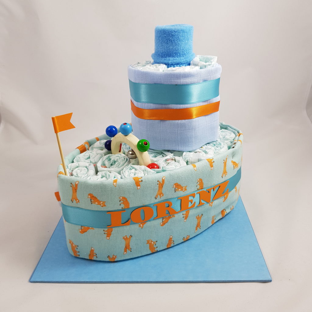 Bestehend aus: 26 Pampers Windeln,2 Flanelltücher 80×80, 2 paar Babysocken, 1 Nuscheli 60×60, 1 Holzrassel