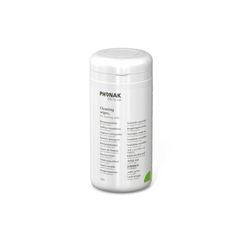 Die Phonak Reinigungstücher im praktischen Spender eignen sich ideal zur täglichen Pflege von Hörgeräten und Ohrpassstücken. Sie entfernen zuverlässig Ohrenschmalz, Schmutz und Bakterien – für mehr Hygiene und längere Lebensdauer Ihres Hörsystems.